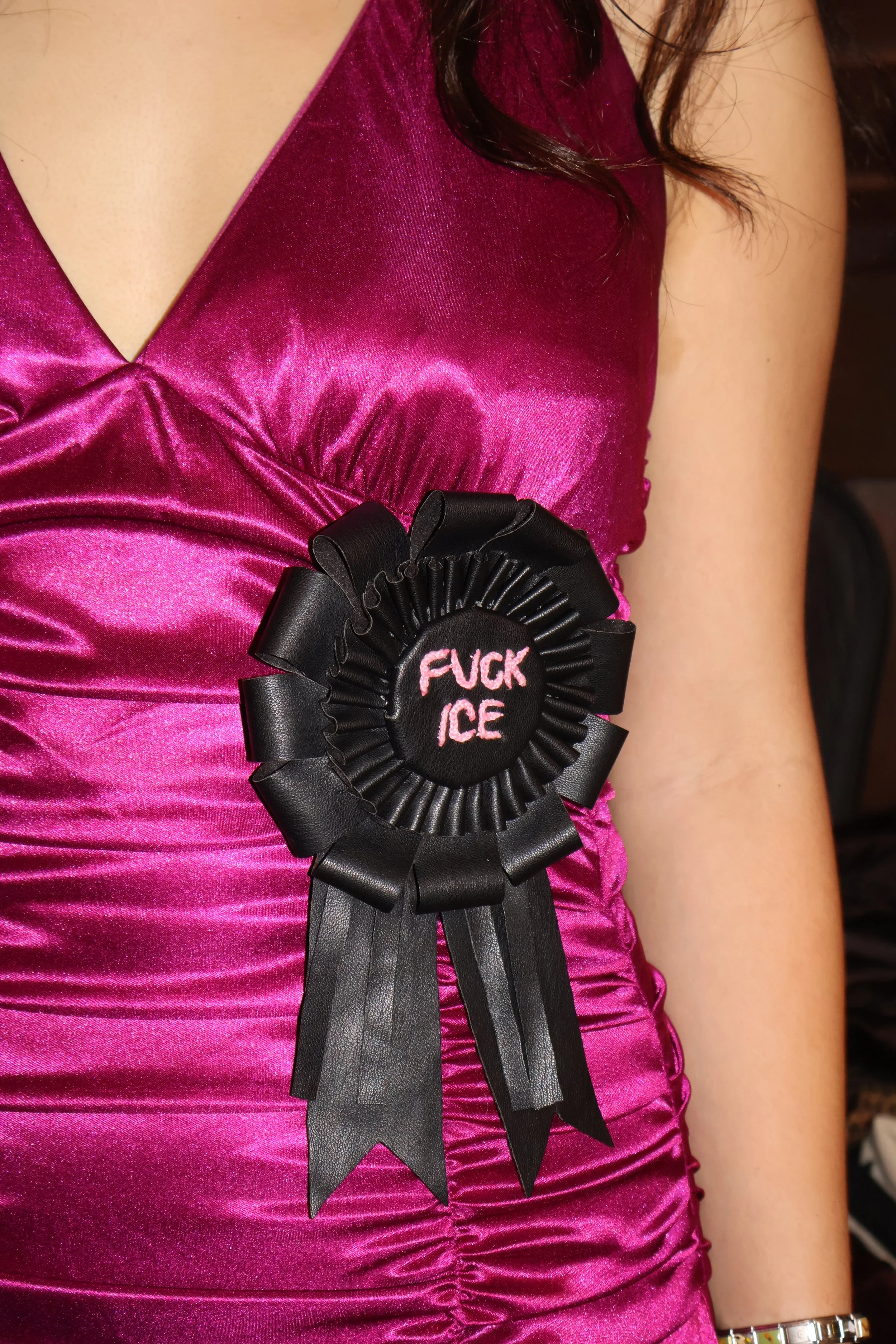 The designs in this runway went beyond internal messages, and Emma Ngo’s design was a prime example of the political power within fashion. Modeled and designed by herself, her piece featured a ball gown covered in black pins with white text stating “FUCK ICE”.
