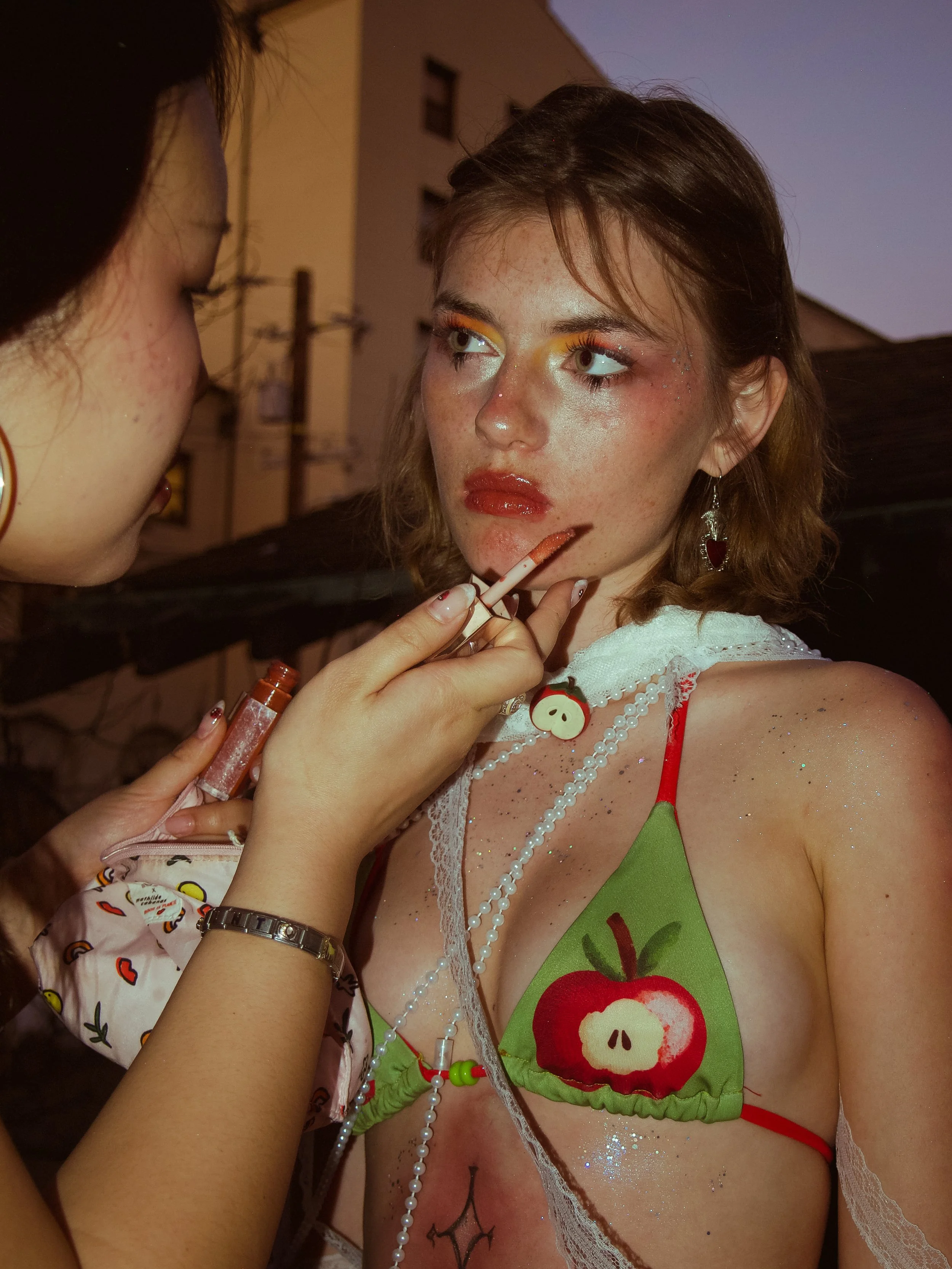 Ruan’s model, Thalia White, was the perfect candidate for this piece. The makeup was unconventional—bold blush, orange eyeshadow, thick singular lashes—it created a perplexity of both beauty and mystery. The most eye-catching part of the look were the bruised, diamond-shaped, faux tattoos that covered White’s body. Ruan even admitted that they were a last-minute call; however, once they were on, she couldn’t imagine the look without them.